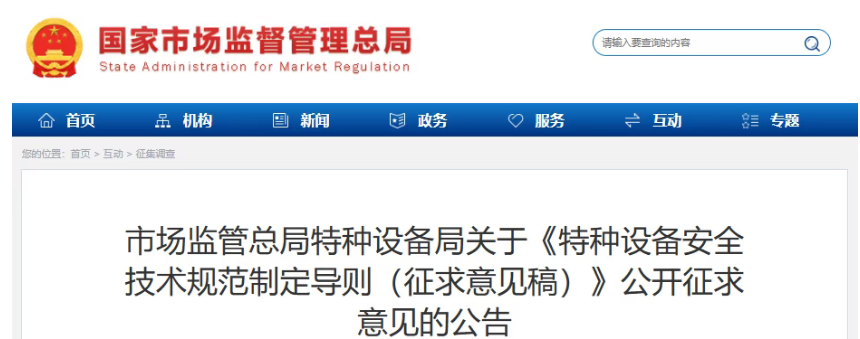为进一步规范和优化特种设备安全技术规范制修订工作,我局组织对《特种设备安全技术规范制定导则》(TSG 01-2014)进行修订,形成《特种设备安全技术规范制定导则(征求意见稿)》(见附件),现根据相关规定向社会公开征求意见。公众可通过以下方式提出反馈意见: