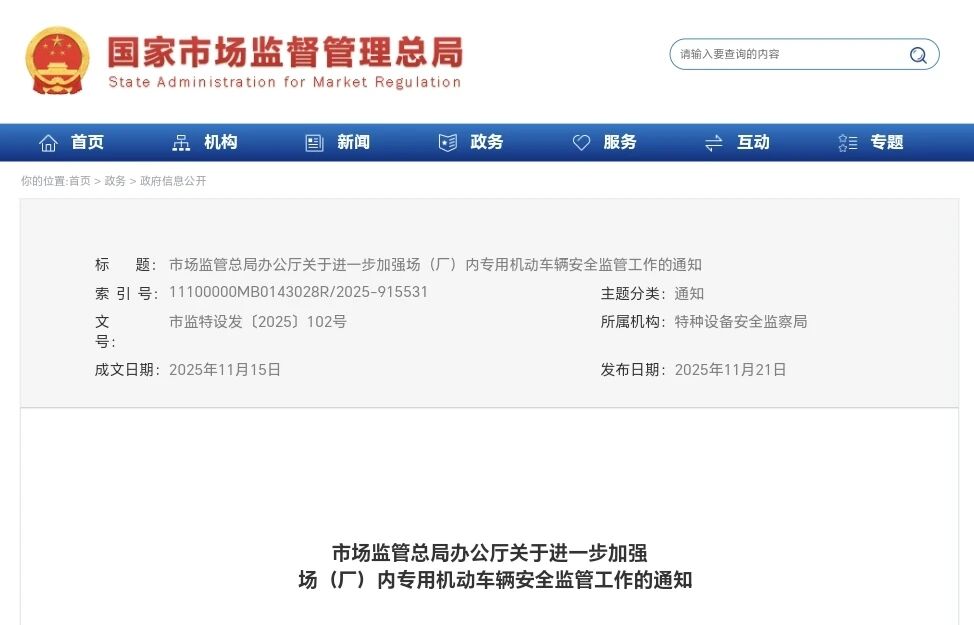 近年来,场(厂)内专用机动车辆(以下简称场车)安全状况总体平稳,但作业人员安全意识淡薄、设备日趋老化、使用环境复杂、极端天气频发等因素交织叠加,事故起数、死亡人数在特种设备中占比较高,安全风险不容忽视。为深入推进场车使用安全治理行动,遏制事故易发多发态势,现就有关事项通知如下。