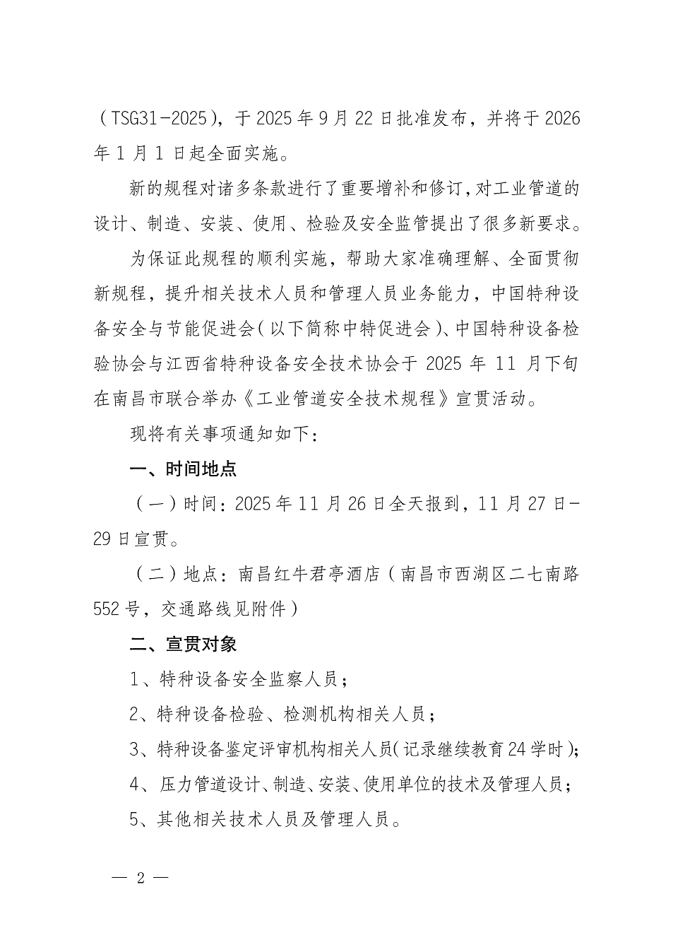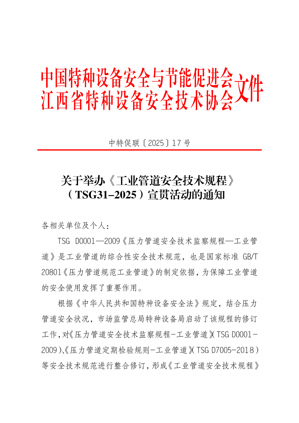 关于举办《工业管道安全技术规程》 (TSG31 -2025)宣贯活动的通知