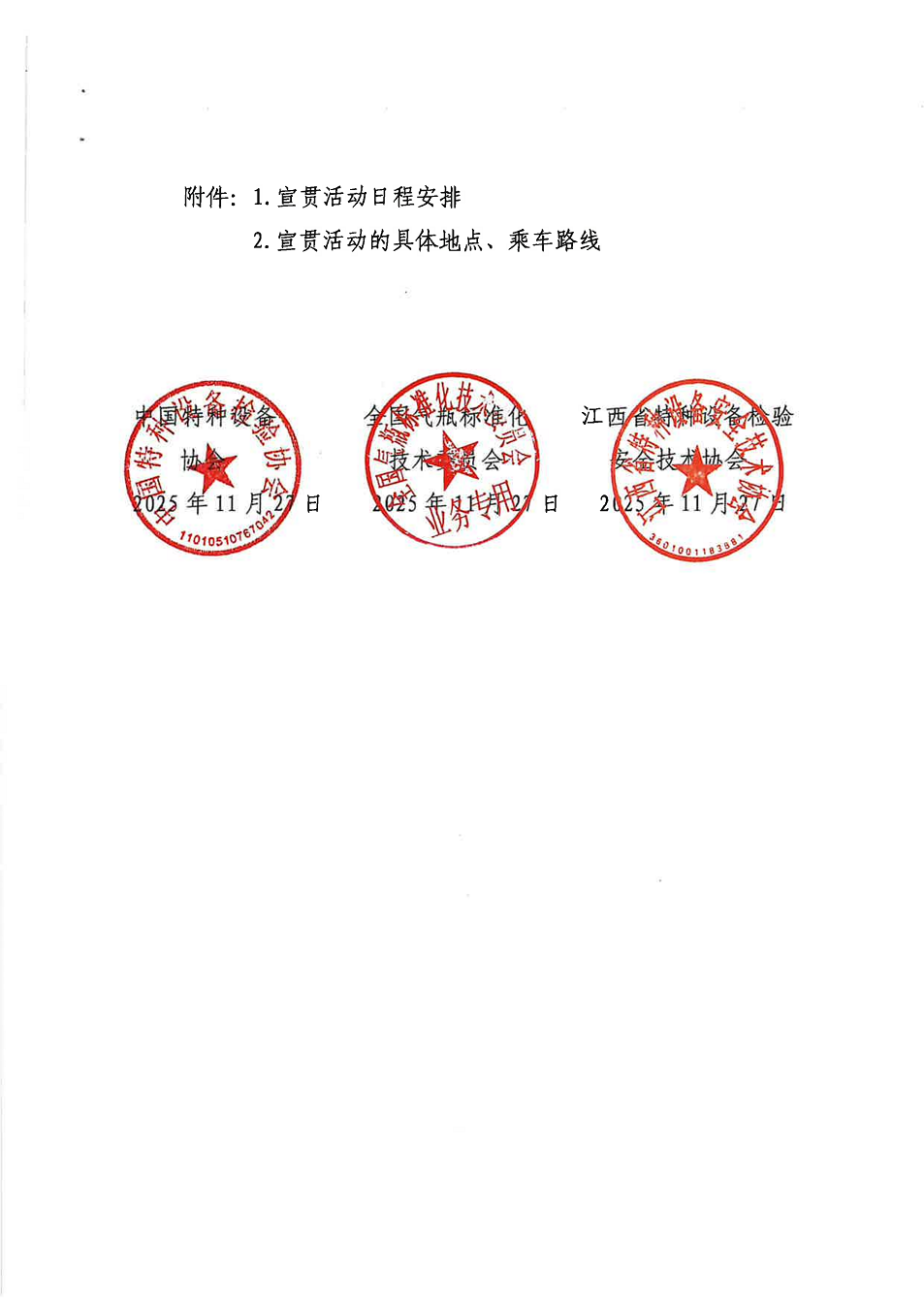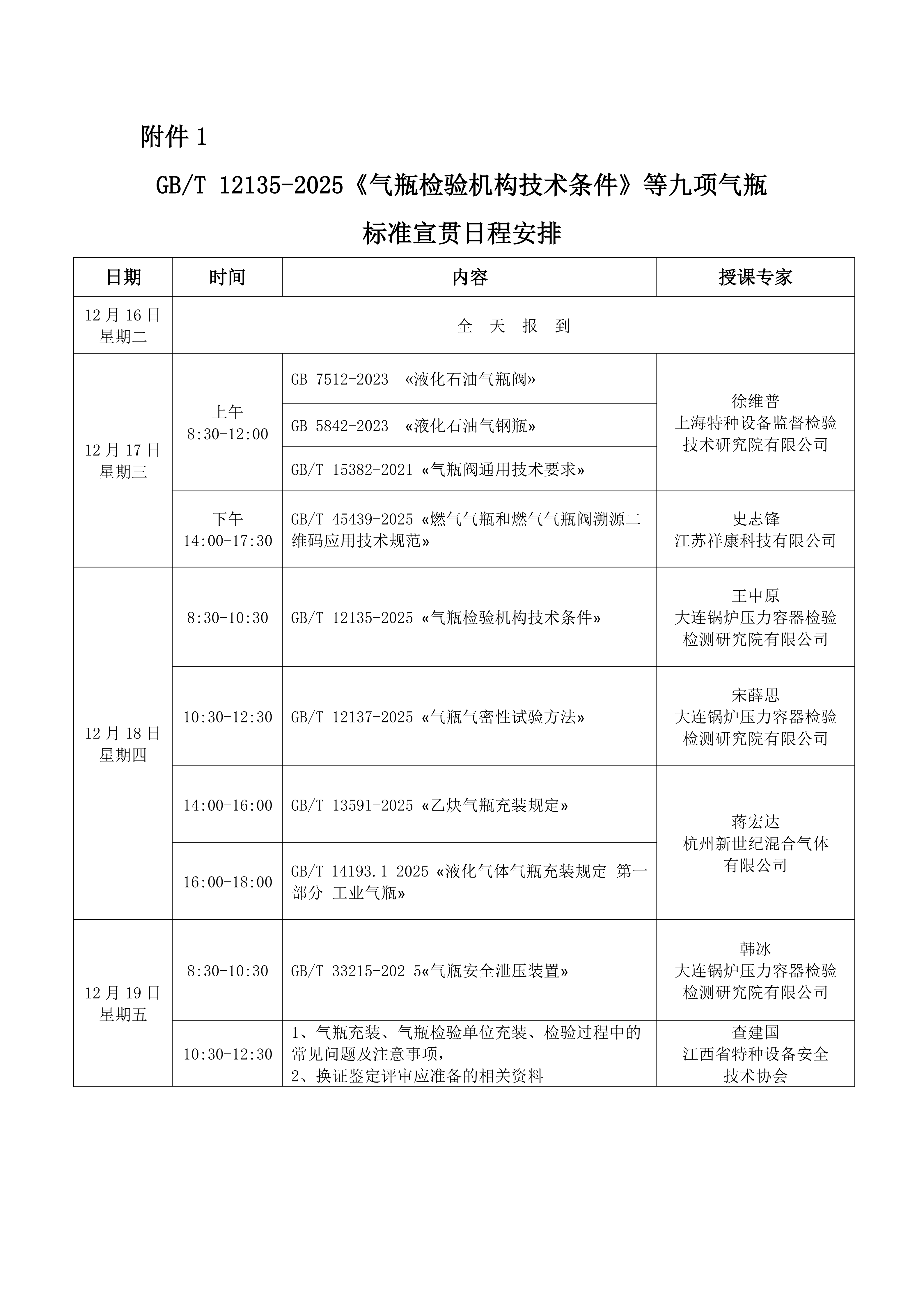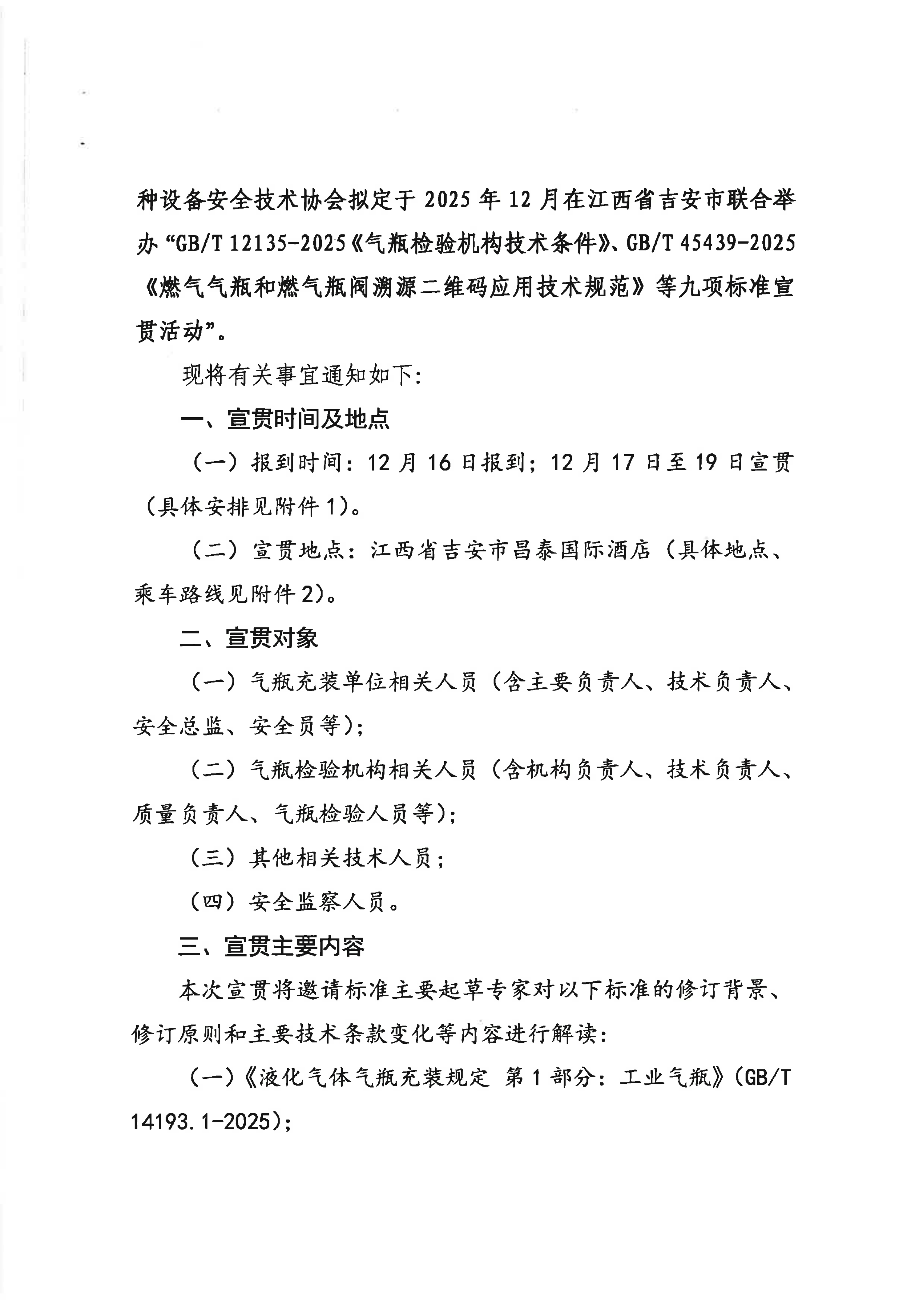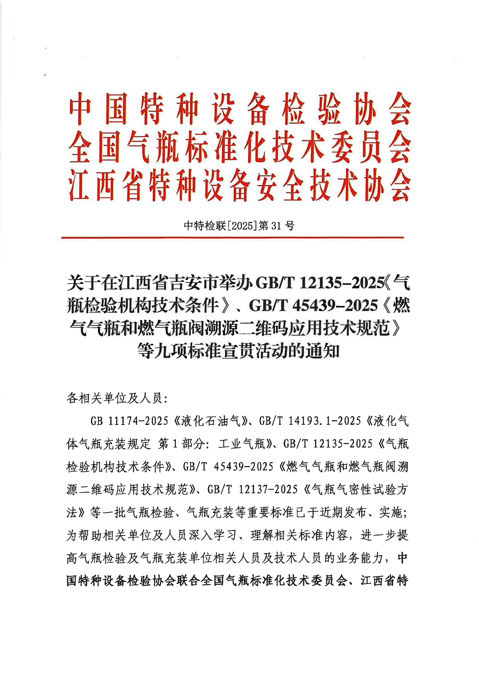 关于在江西省吉安市举办GB/T 12135-2025《气瓶检验机构技术条件》、GB/T 45439-2025《燃气气瓶和燃气瓶阀溯源二维码应用技术规范》等九项标准宣贯活动的通知