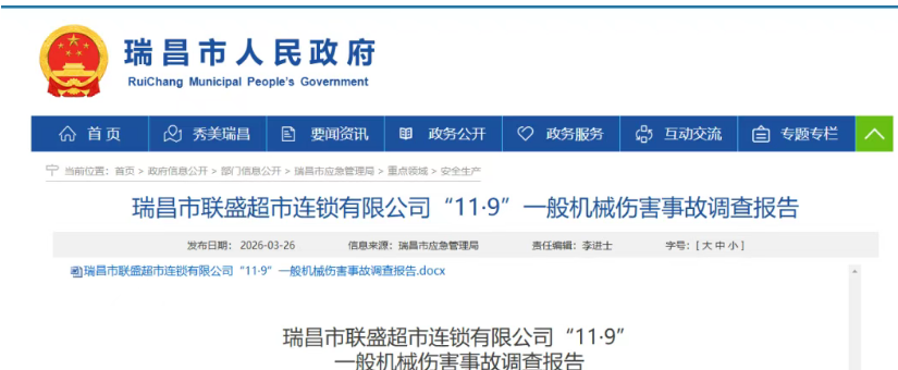 2025 年11月9日 6 时 32 分,瑞昌市联盛超市连锁有限公司发生一起致 1人死亡的机械伤害事故。直接经济损失约人民币195 万元。