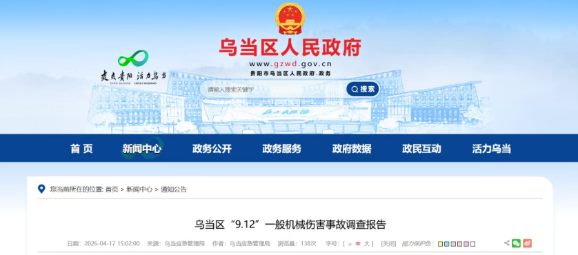 经调查认定乌当区“9·12”机械伤害事故是一起一般生产安全责任事故。